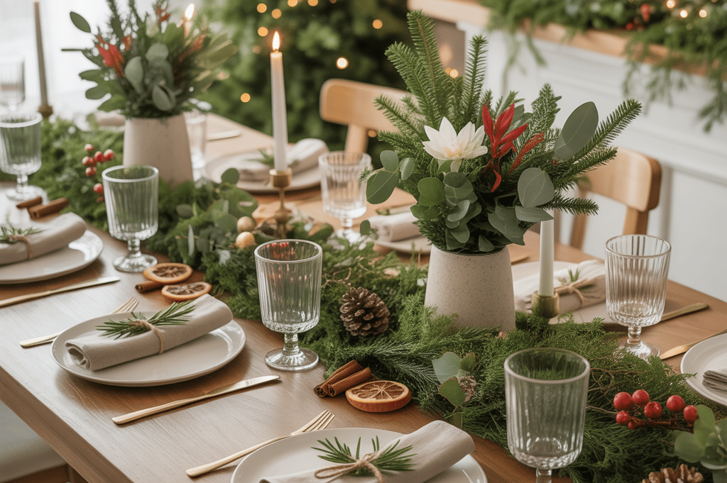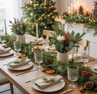 Celebrate nature’s beauty with a table filled with lush greenery and fresh blooms. Use a forest-inspired tablecloth or simple wooden chargers and pairing them with plates decorated with botanical motifs. Decorate with garlands of eucalyptus, holly, and pine, interspersed with red and white floral accents. Incorporate seasonal elements like cinnamon sticks, dried citrus slices, and small pinecones. Use clear or green-tinted glassware, paired with simple linen napkins tied with twine and a sprig of rosemary or holly.