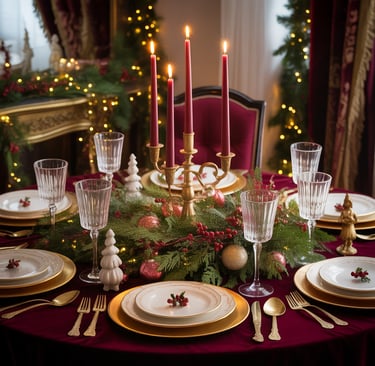 Bring a touch of Old Hollywood to your Christmas dinner with a vintage glamour setup. Use a velvet or satin tablecloth in deep jewel tones like burgundy or emerald. Decorate with gold or brass candlesticks, ornate tea sets, and antique-inspired glassware. Place vintage Christmas figurines or crystal ornaments along the center. Add lush greenery with sprigs of holly and red berries. For place settings, opt for gold-rimmed china and elegant cloth napkins with decorative brooches or pins.