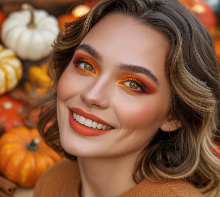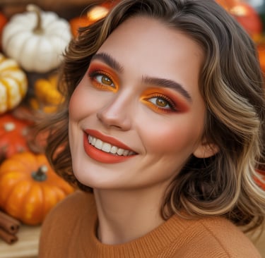 Pumpkin, cinnamon, and spice tones bring a festive and cozy charm to your fall makeup. Warm orange or burnt sienna eyeshadows blended with soft browns create a beautiful, sunset-inspired look. A coral or terracotta lipstick adds a subtle pop of color, while a bright pumpkin-orange shade gives a playful twist. Finish with a peachy blush or warm bronzer to complete the perfect pumpkin spice glow.