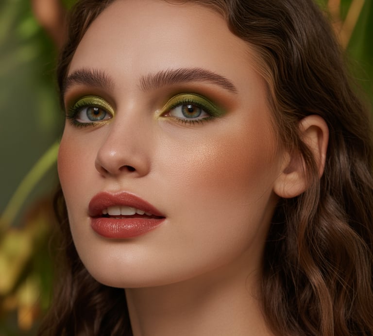 Green tones offer a fresh and modern twist on classic fall makeup while staying true to the season’s earthy feel. Olive and moss shades look especially beautiful with warm skin tones and neutral outfits. Softly blended olive eyeshadow with deeper tones in the crease adds depth, while a hint of gold in the inner corners brightens the eyes. Pair this look with nude or earthy lips for a natural finish, or balance it with a deep berry or brick red lipstick for contrast. A touch of bronzer and light peach blush ties the look together with a warm, grounded glow.