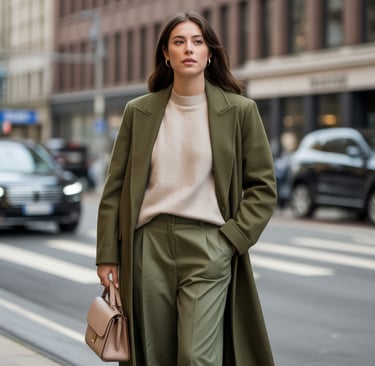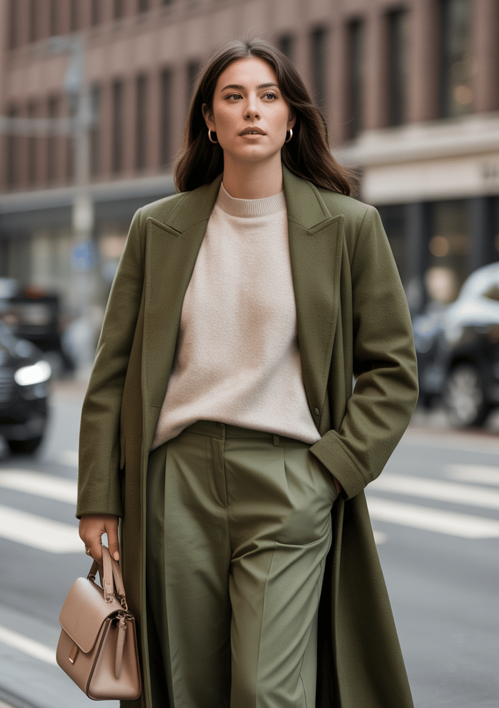 Earth tones continue to reign, but this season they deepen into luxurious greens. Olive feels grounded and wearable, whether in sleek trousers or a tailored long coat. Pair it with warm neutrals to create depth or contrast it with gold jewelry for a regal finish.