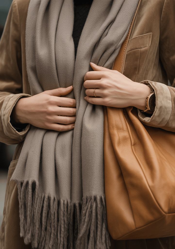 Cashmere & Wool: Rich knits bring warmth and softness, transforming simple silhouettes into plush wardrobe staples. Think oversized scarves, ribbed sweaters, and long cardigans.