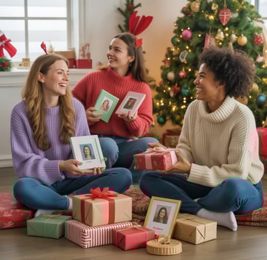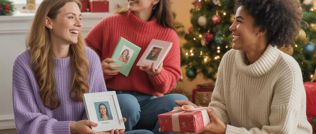 Discover a festive and joyful holiday scene showcasing a variety of christmas gifts for friends. Include personalized items such as custom photo portraits, eco-friendly tech gadgets, wellness and self-care kits, and experience gift passes.
