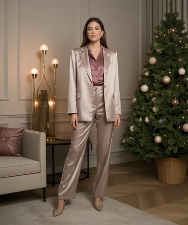 A perfectly tailored pant or skirt suit in soft satin or wool, in neutral shades like beige, charcoal, or black, exudes authority with a festive flair. Match with a silk blouse in a muted berry or blush hue. Finish with classic leather pumps in black or nude for an understated, refined silhouette. Sleek ankle boots in patent or matte finish can also add a modern twist while maintaining sophistication.