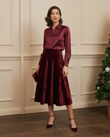 A high-waisted, structured A-line skirt in velvet, wool, or brocade paired with a silk or satin blouse creates a timeless silhouette. Elevate with understated jewelry and pointed-toe heels. Classic pumps in deep hues or metallic shades perfectly complement this look. Elegant ankle-strap shoes or low kitten heels add a chic, understated sophistication.