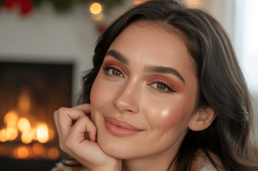 For those cozy holiday nights by the fireplace, a warm, glowing makeup look is ideal. Use earthy tones like cinnamon, copper, and rose gold to create a soft yet radiant eye makeup. Add a touch of highlighter on your cheekbones, nose, and cupid’s bow to mimic that holiday glow. Finish with a nude or soft pink lipstick, and you’re ready to comfort and shine all night long. This look exudes warmth and friendliness, perfect for intimate celebrations.