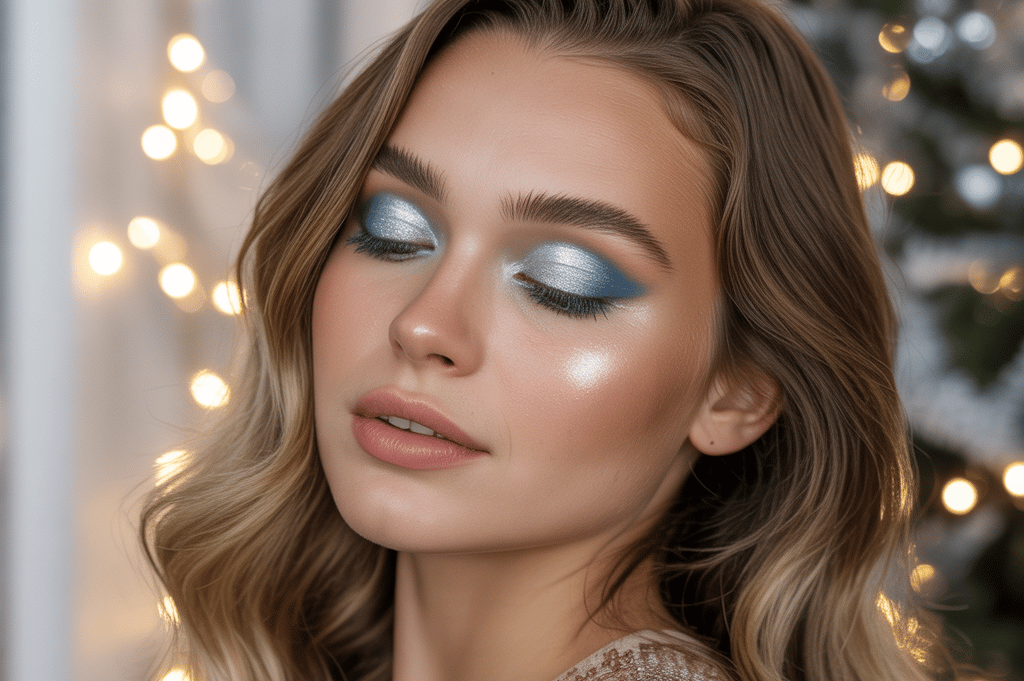 Channel your inner winter fairy with a glitter-infused makeup look. Think icy blues, silvers, and holographic shades that mimic a snowy wonderland. Use a shimmery eyeshadow palette to create a frosty eye look, and add glitter accents on the inner corners or along your brow bone. For the lips, opt for a nude gloss to keep the focus on your eyes. This look is playful, dreamy, and sure to turn heads at any Christmas party.