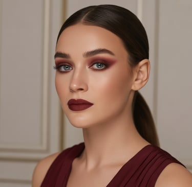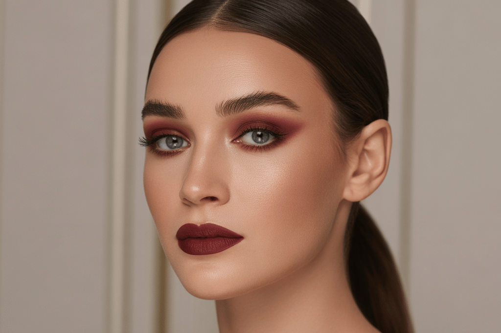 If you prefer a more understated yet sophisticated style, try a matte burgundy eyeshadow paired with a matching lipstick. Keep your base fresh and clean, add a little contour for definition, and let your eyes and lips do the talking. This look is perfect for holiday dinners and more formal gatherings, offering a chic and polished appearance without overwhelming your features.
