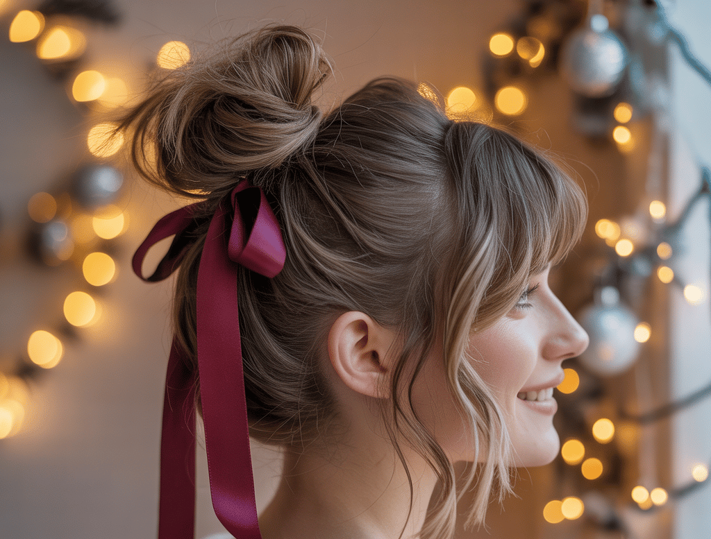 If you’re after a relaxed yet fashionable look, a messy bun is perfect. Twist your hair into a loose bun and secure with pins, then make it festive by adding ribbons, small ornaments, or sprigs of holly. This style is comfortable, effortless, and ideal for those who want to look stunning without spending hours on their hair.